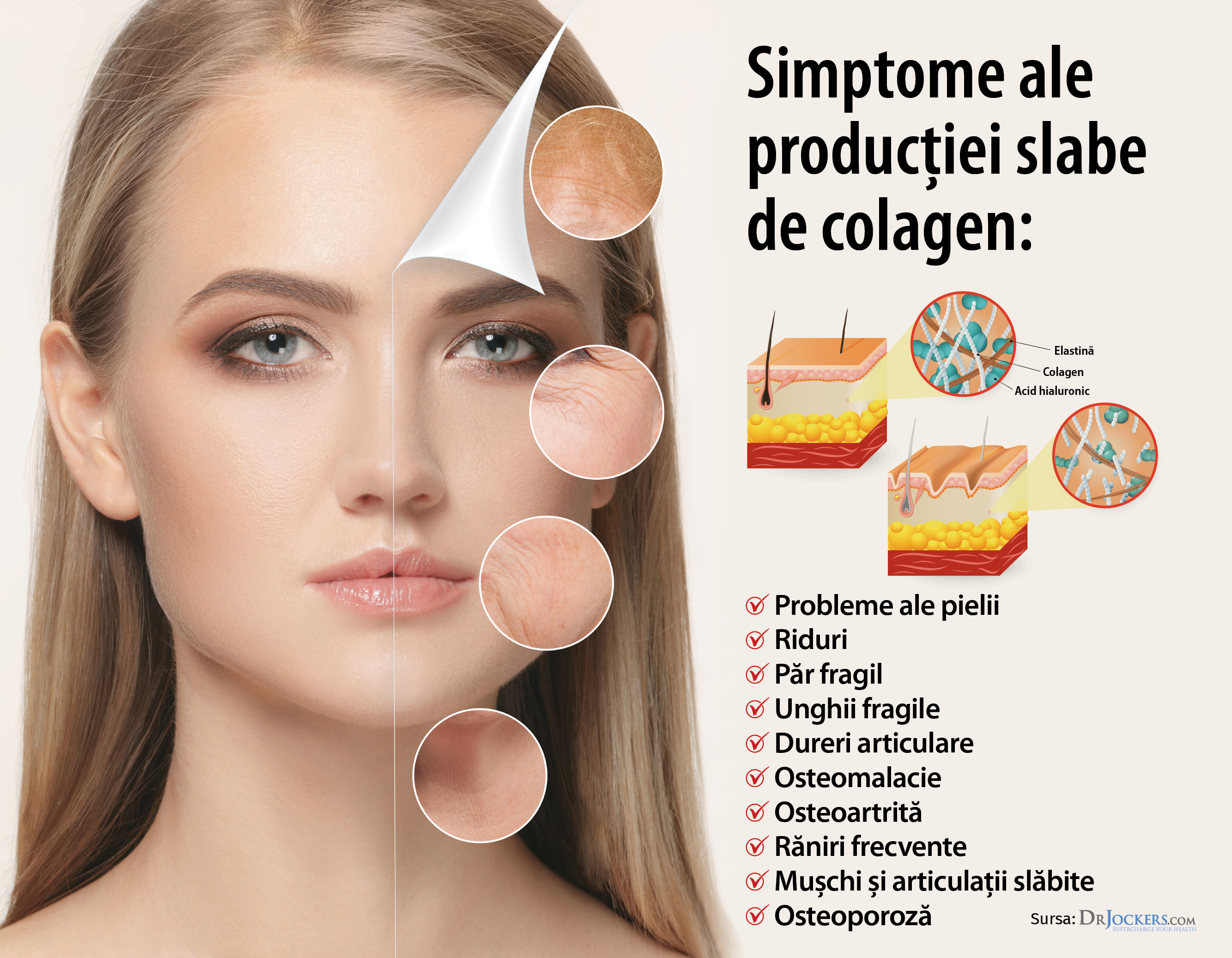 Pe măsură ce înaintăm în vârstă, producția de colagen proprie sau endogenă începe să scadă, ceea ce ne poate afecta atât aspectul, cât și sănătatea. Partea bună este că în prezent există numeroase soluții la care putem apela pentru a corecta deficiența de colagen. Una dintre ele este evitarea, în măsura în care este posibil, a factorilor care produc stres oxidativ în organism (fumatul, consumul excesiv de zahăr, stresul, lipsa somnului, expunerea la soare) și adoptarea unei diete bogate în nutrienți esențiali, aminoacizi, vitamina C și minerale.