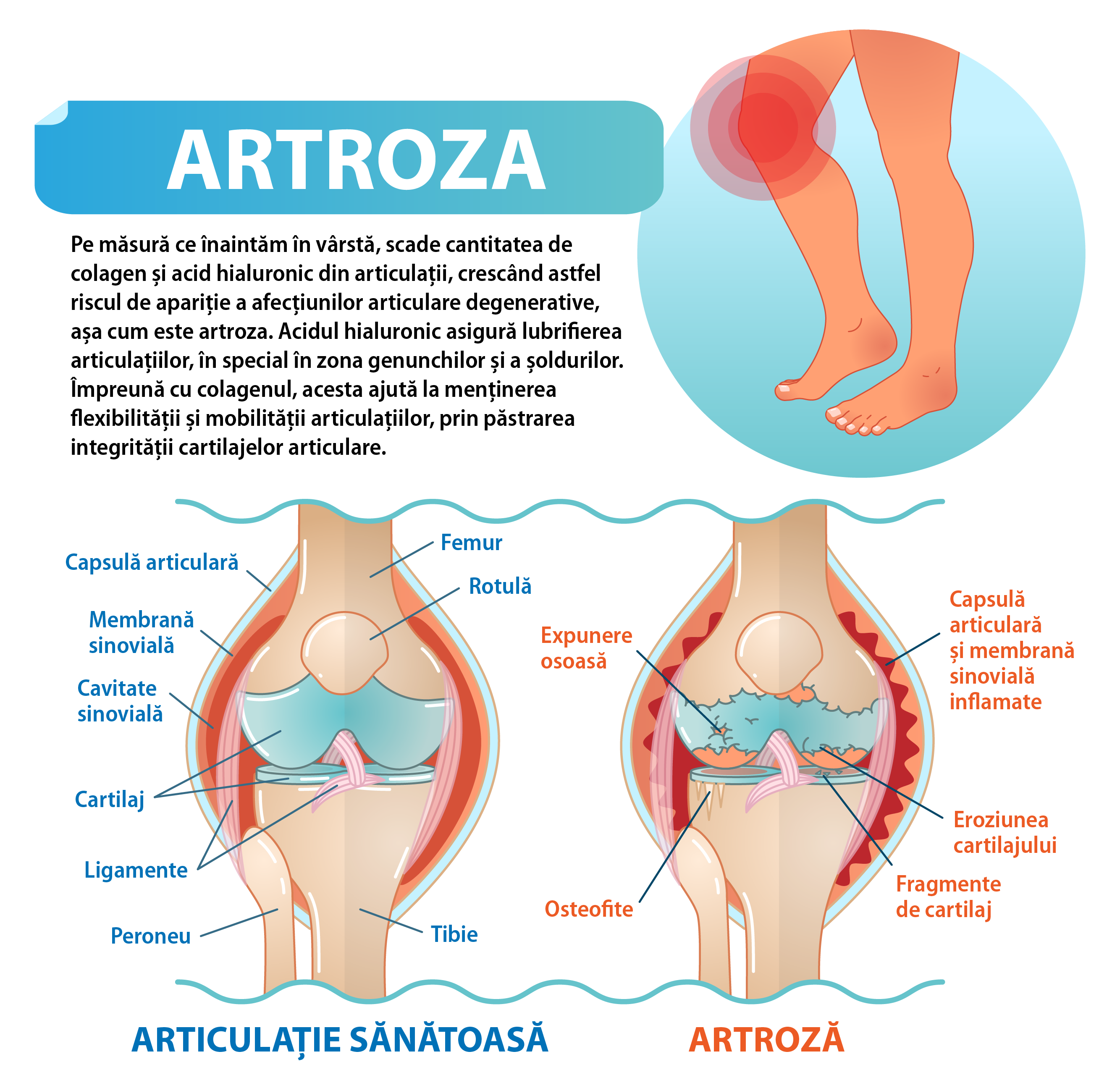 O dată cu înaintarea în vârstă, colagenul natural începe să scadă și ne putem confrunta cu articulații rigide sau dureroase sau chiar cu apariția afecțiunilor articulare degenerative, cum ar fi osteoartrita. Colagenul sprijină capacitatea organismului de a produce substanțe chimice care susțin în mod natural articulațiile sănătoase: condroitină, glucozamină și acid hialuronic.