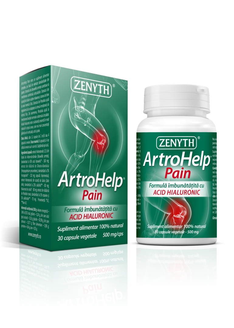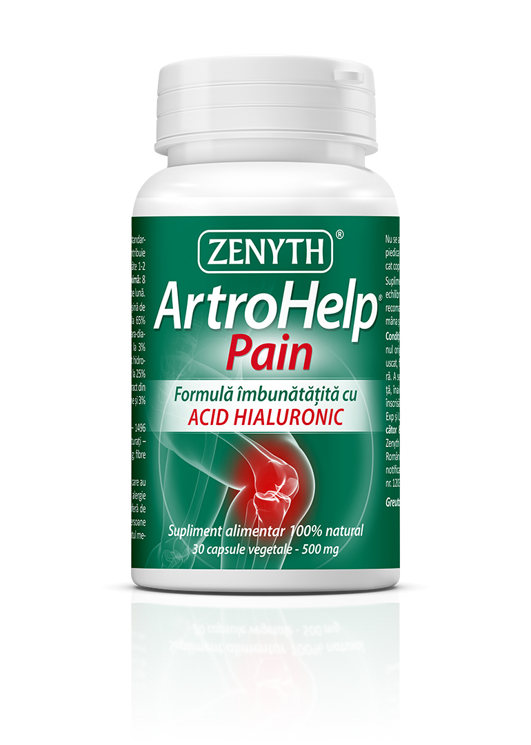 NOU! ArtroHelp Pain – formulă îmbunătățită cu acid hialuronic! Pentru o mai bună mobilitate și flexibilitate a articulațiilor, formula ArtroHelp Pain a fost îmbunătățită cu acid hialuronic, un excelent lubrifiant al articulațiilor. Când suferi de dureri articulare, intri într-un cerc vicios: dureri articulare – sedentarism și kilograme în plus – izolare – depresie – odihnă insuficientă și somn neliniștit – apariția altor dureri, într-un cuvânt calitate scăzută a vieții. Produsele ArtroHelp îți redau libertatea de mișcare și îți îmbunătățesc calitatea vieții: în vreme ce ArtroHelp Pain reduce disconfortul creat de dureri, ArtroHelp Forte hrănește articulațiile și ajută la regenerarea cartilajelor.