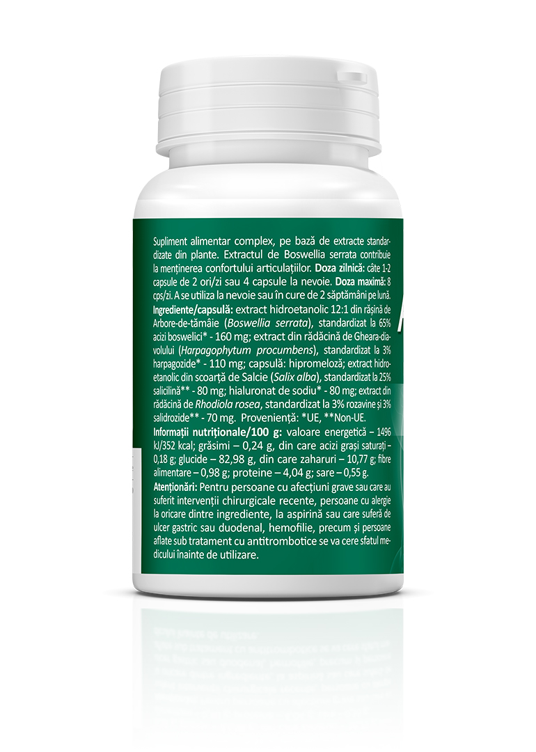 Ingrediente/capsulă: extract standardizat cu min. 65% acizi boswelici din rășină de Boswellia serrata – 160 mg; capsule vegetale: hipromeloză; extract standardizat cu min. 2,5 harpagozide din rădăcină de Gheara-diavolului (Harpagophytum procumbens) – 110 mg; extract standardizat cu min. 25% salicină din scoarță de Salcie (Salix alba) – 80 mg; hialuronat de sodiu – 80 mg; extract standardizat cu min. 3% rosavine și 3% salidrozide din rădăcină de Rhodiola (Rhodiola rosea) – 70 mg.