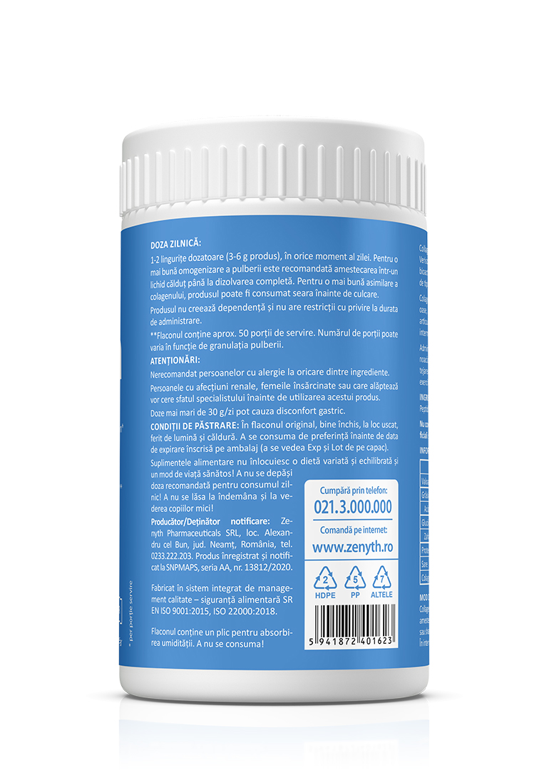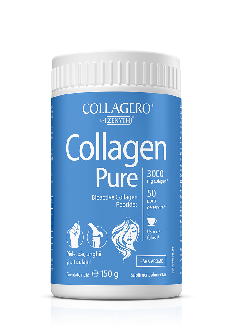 Collagen Pure este un supliment alimentar pe bază de colagen Verisol®, sub formă de pulbere. Colagenul Verisol® este un amestec de peptide bioactive, obținute printr-un proces patentat de hidroliză a colagenului de tip I și III. Colagenul este proteina constituentă a țesutului conjunctiv (piele, oase, ligamente). Colagenul intră în componența mușchilor, cartilajelor articulare, discurilor intervertebrale, oaselor, tendoanelor, organelor interne, pielii, părului sau unghiilor. Administrat intern, colagenul reprezintă o sursă concentrată de aminoacizi (glicină, prolină, lizină). Sub formă de suplimente, colagenul poate fi folosit pentru protejarea pielii, părului, unghiilor, articulațiilor, pentru refacerea după exerciții fizice intense. REȚINEȚI! Pentru a fi absorbită de către organism, molecula de colagen trebuie „spartă“ în particule mai mici. Acest lucru se face prin procesul numit hidroliză. Produsul Collagen Pure de la Zenyth conține peptide bioactive de colagen hidrolizat, care se absorb ușor de către organism.