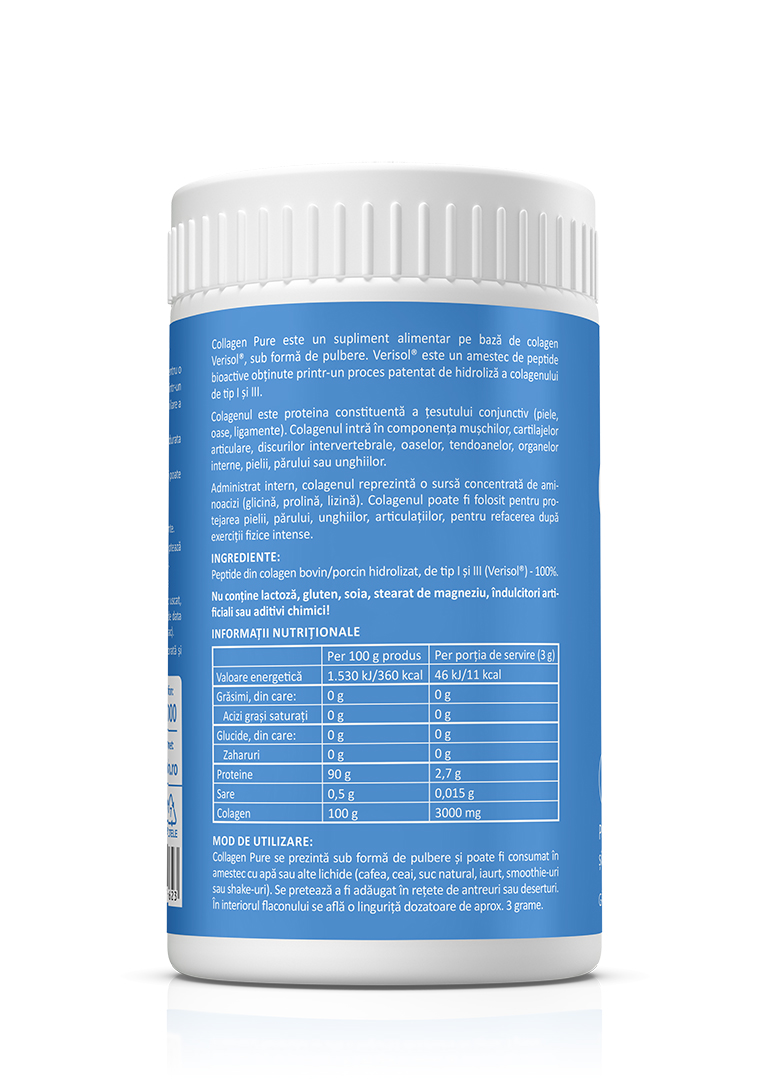 Colagenul este componenta structurală majoră a pielii, aproximativ 80% din greutatea uscată a pielii. Pielea este afectată de o mulțime de factori, dintre care enumerăm dieta, vârsta, radiațiile ultraviolete, modificările hormonale. Colagenul Verisol® este cea mai utilizată marcă de colagen în produsele de frumusețe, la nivel mondial. Studiile au arătat că Verisolul® stimulează metabolismul colagenului pielii, favorizează regenerarea pielii, ajutând la îmbunătățirea structurii și aspectului pielii, la mărirea gradului de hidratare, la întârzierea formării ridurilor și la reducerea acestora. Pielea folosește aminoacizii din colagen în procesele reparatorii, dar și pentru înlocuirea celulelor pielii și țesuturilor de colagen. Suplimentarea cu peptide de colagen, așa cum sunt cele prezente în produsul Collagen Pure, nu crește doar nivelurile de colagen din piele, ceea ce face pielea mai fermă și suplă, ci reduce și activitatea colagenazei, o enzimă care descompune colagenul din matricea extracelulară. Un studiu efectuat pe 100 de femei, cu vârsta în jur de 55 de ani, a arătat reducerea semnificativă a ridurilor prin administrarea orală a 2,5 g Verisol® pe zi. Studiul, publicat în revista Skin Pharmacol. Physiology, în decembrie 2013, a durat 4 săptămâni și, pe lângă reducerea ridurilor, s-a observat creșterea nivelului colagenului în piele, cu până la 60%. REȚINEȚI! Porția zilnică de Collagen Pure furnizează 3 g colagen Verisol®. Vorbim în acest caz despre colagen pur de tip I și III, fără nici un fel de arome adăugate, fără lactoză, gluten, soia, stearat de magneziu, îndulcitori artificiali sau aditivi chimici!