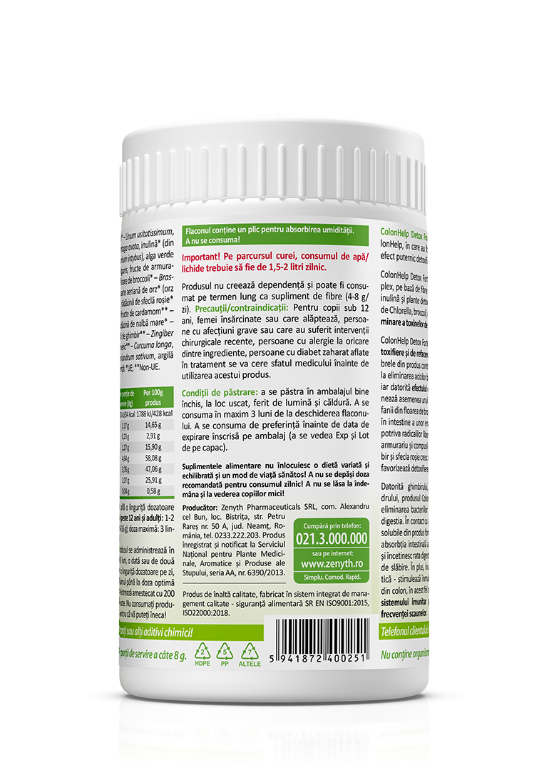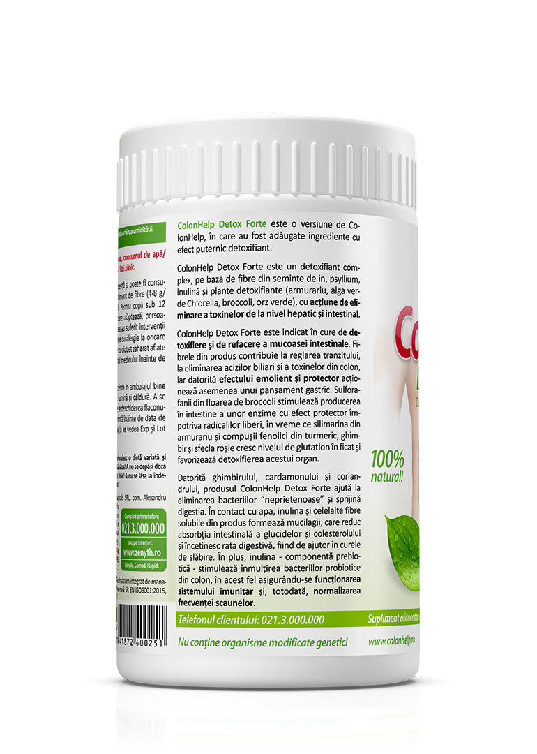 ColonHelp Detox Forte este un produs 100% natural, un detoxifiant complex cu o formulă inovatoare. Acțiunea fibrelor de in și psyllium din ColonHelp clasic este completată în acest produs de conținutul de prebiotice (inulină) și plante detoxifiante hepatice (armurariu, alga verde Chlorella, broccoli, orz verde). produsul având rol de detoxifiant hepatic și intestinal. ColonHelp Detox Forte acționează pe mai multe planuri: îmbunătățirea proceselor digestive, regenerarea mucoasei intestinale, optimizarea detoxifierii intestinale și a celei hepatice, creșterea protecției antioxidante a organismului, împiedicarea recirculării substanțelor toxice și a reziduurilor metabolice, stimularea sistemului imunitar.