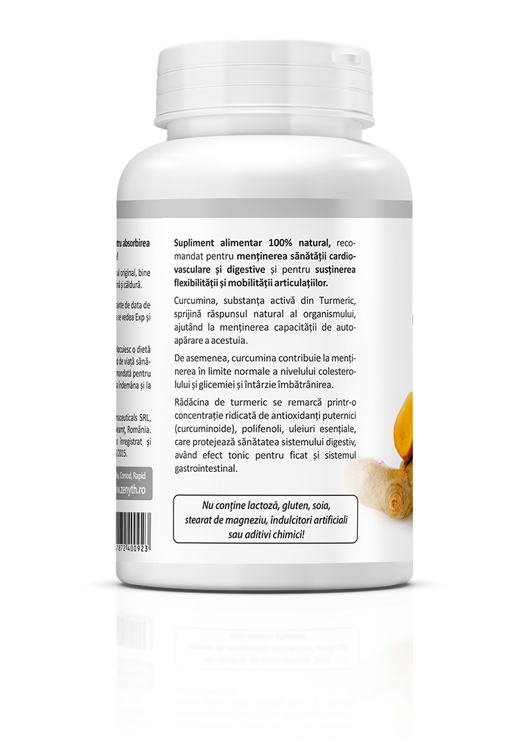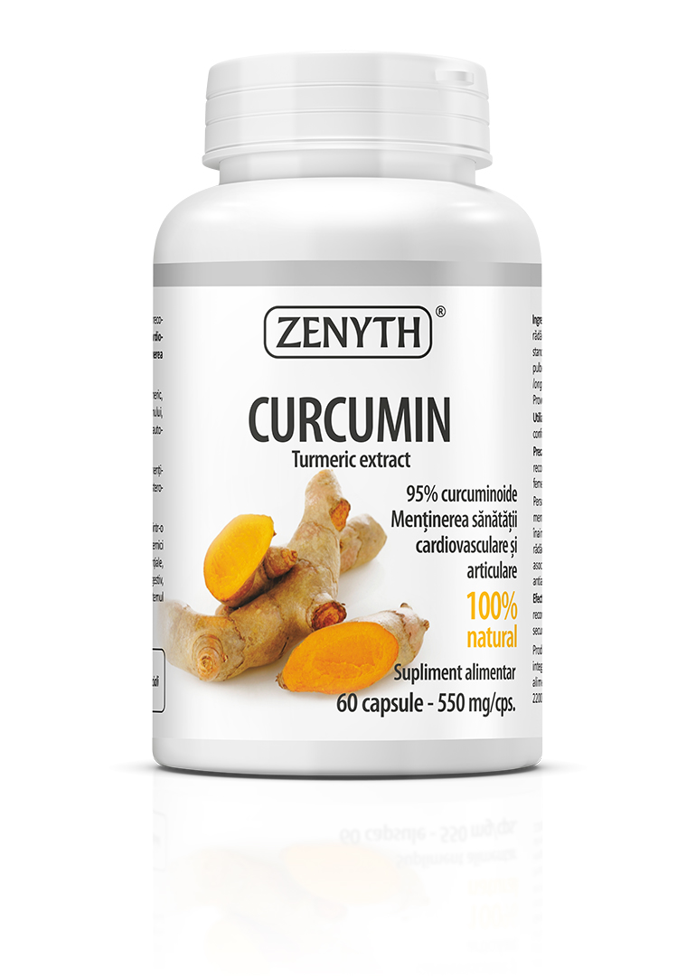 Curcumin este un supliment alimentar 100% natural, recomandat pentru menținerea sănătății cardiovasculare și digestive și pentru susținerea flexibilității și mobilității articulațiilor. Cu extract standardizat de turmeric, conținând 95% curcuminoide, Curcumin are o formulă puternică și eficientă, concentrând beneficiile acestui nutrient într-o formă ușor de administrat.