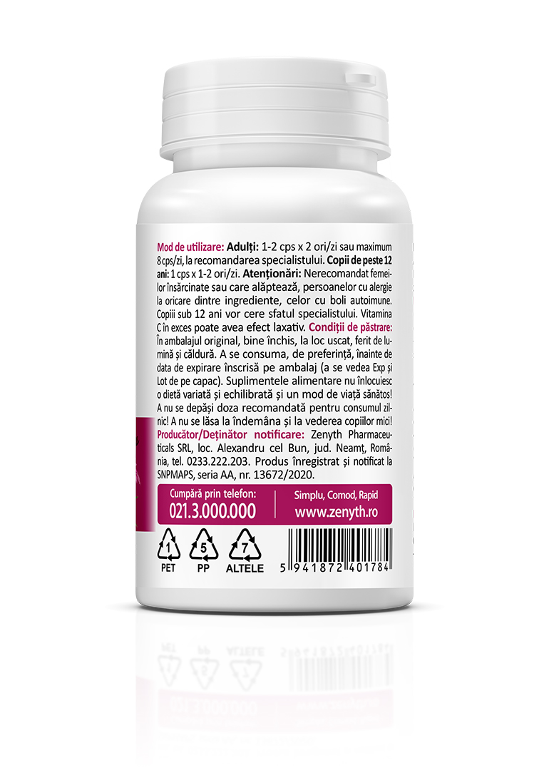 • Conține vitamina C (250 mg/capsulă) și zinc (10 mg/capsulă) pentru rezultate de la primele administrări.