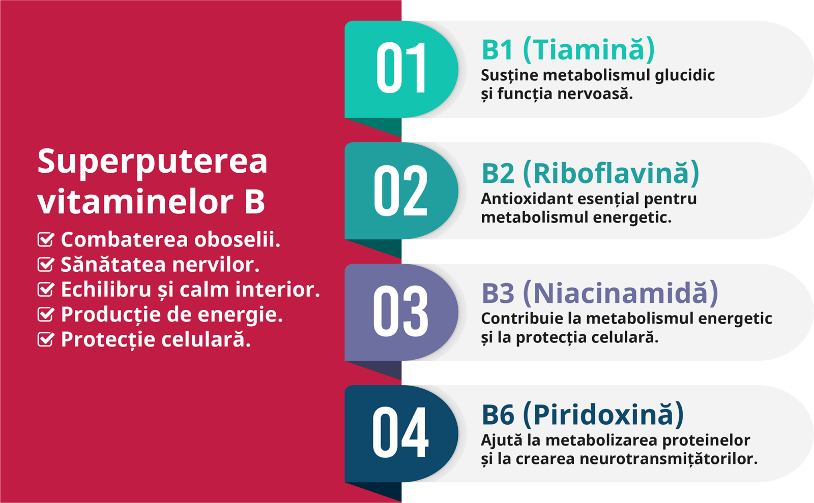 Complexul de vitamine B este esențial pentru metabolismul energetic.