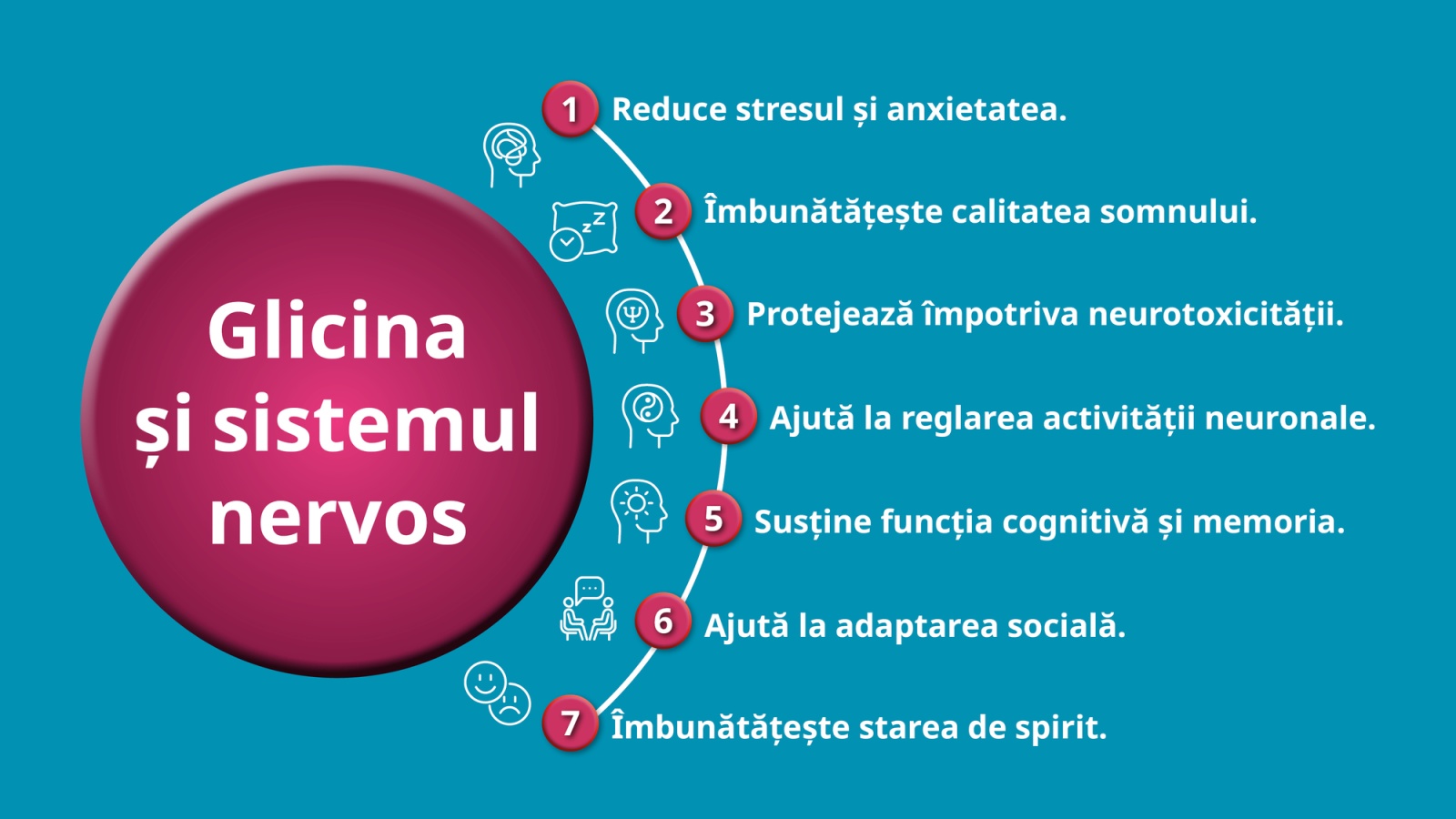 Prin intermediul acțiunii sale inhibitoare, glicina ajută la reglarea activității neuronale, prevenind supraexcitarea și contribuind la menținerea unui echilibru în funcționarea creierului. Aceasta are un rol important în inhibarea impulsurilor nervoase excesive, ceea ce poate fi benefic în contextul reducerii anxietății și stresului.