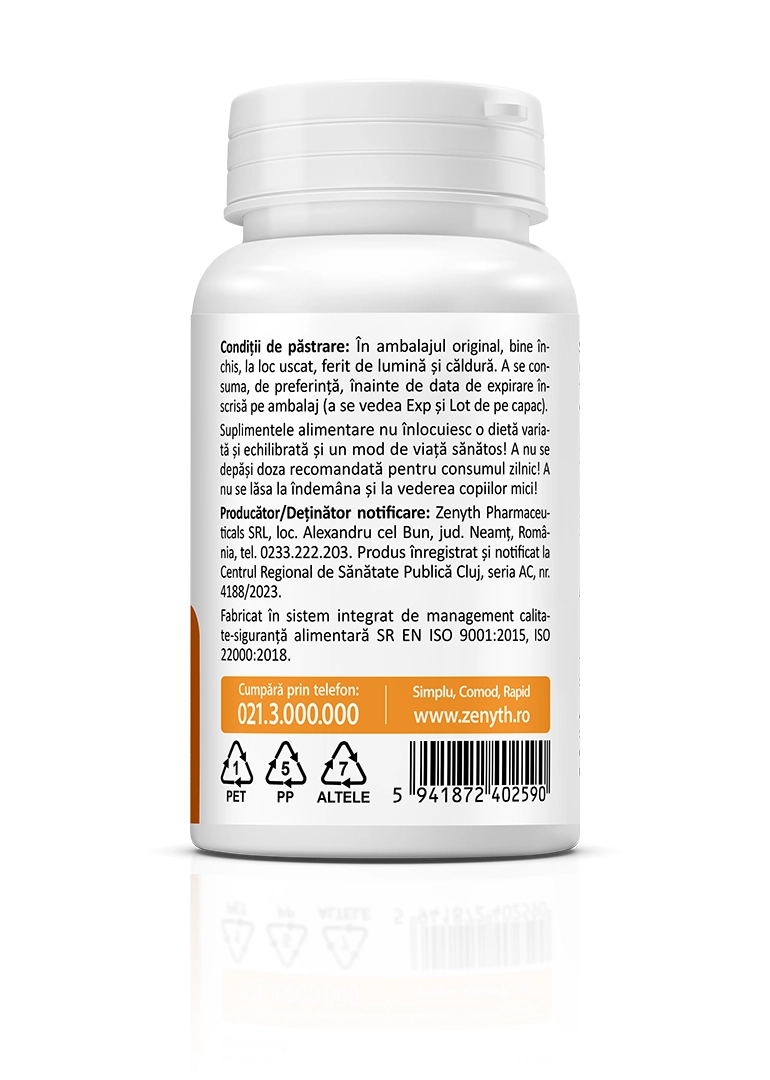 Producător/Deținător notificare: Zenyth Pharmaceuticals SRL, loc. Alexandru cel Bun, jud. Neamț, România, tel. 0233.222.203. Notificare la CRSP Cluj seria AC, nr. 4188/2023.