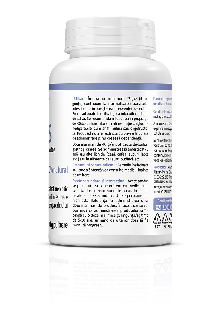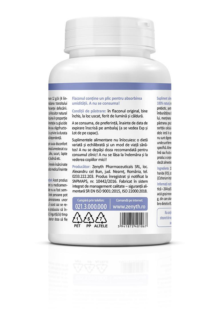 Inulin FOS este un supliment alimentar 100% natural, pur, din inulină și fructo-oligozaharide din rădăcină de cicoare. Inulina și fructo-oligozaharidele intră în categoria fibrelor dietetice, care nu sunt digerate și ajung nedegradate în colon, unde sunt fermentate de către flora microbiană specifică. Alimentele, băuturile care conțin inulină sau fructo-oligozaharide în loc de zaharuri produc o creștere mai mică a glucozei în sânge decât alimentele, băuturile care conțin zahăr.