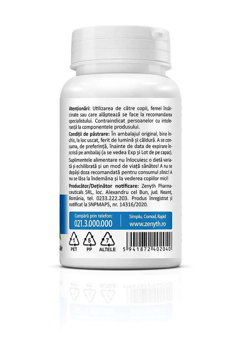 Producător/Deținător notificare: Zenyth Pharmaceuticals SRL, loc. Alexandru cel Bun, jud. Neamț, România, tel. 0233.222.203. Produs înregistrat și notificat la SNPMAPS, nr. 14316/2020.