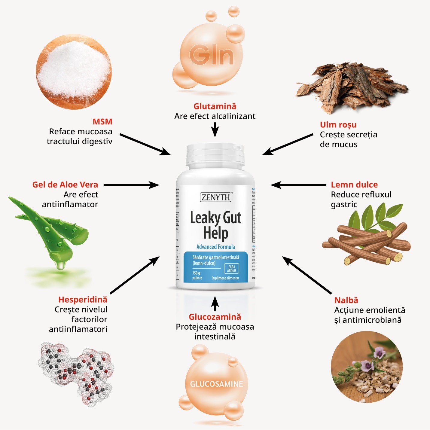 Leaky Gut Help este un supliment alimentar care are la bază o formulă complexă, bazată pe glutamină, glucozamină, lemn dulce, gel de aloe vera, ulm roșu, MSM, nalbă și hesperidină. Toate aceste ingrediente acționează sinergic și au proprietăți antiinflamatorii, antiulceroase, calmante, epitelizante, cicatrizante.