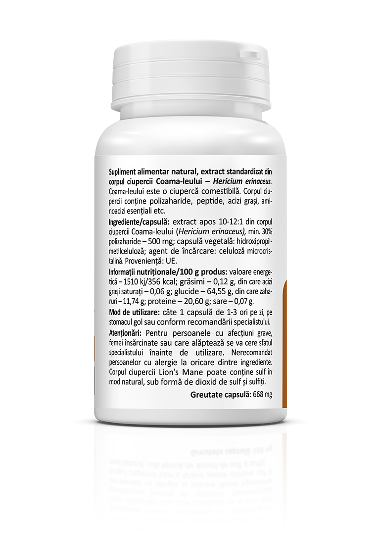 • 500 mg extract din corpul ciupercii Coama leului (Hericium erinaceus) per capsulă.