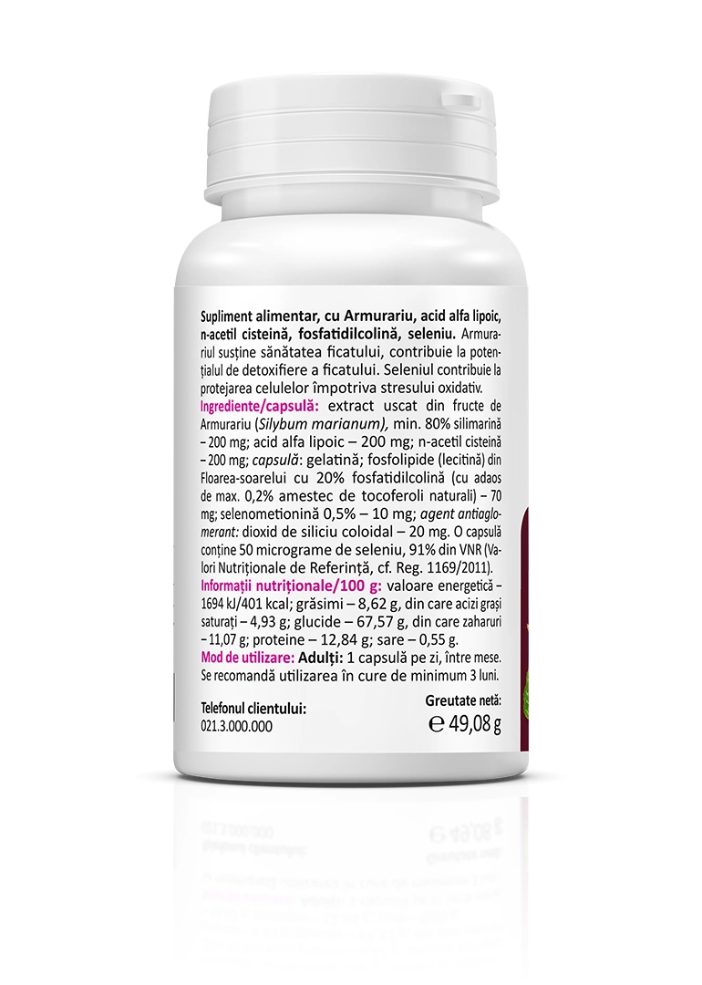 - 200 mg extract de armurariu, cu 80% silimarină, pe capsulă.