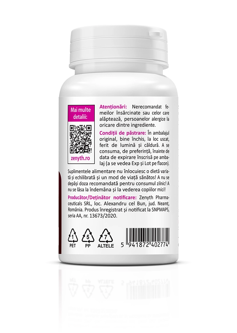 Producător/ Deținător notificare: Zenyth Pharmaceuticals SRL, loc. Alexandru cel Bun, jud. Neamț, România, tel.: 0233.222.203. Produs înregistrat și notificat la SNPMAPS, nr. 13673/2020.