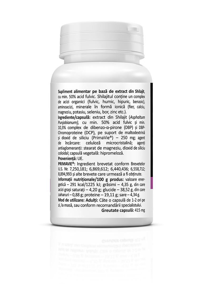 PrimaVie® este un extract purificat de Shilajit, una dintre cele mai studiate și testate forme de Shilajit. Ingredientul PrimaVie® provine din Himalaya și conține min. 50% acid fulvic, min. 10,3% complex de dibenzo-α-pirone (DBP) și DBP-Chromoproteine (DCP) și 40 de alte microelemente (minerale). Shilajitului a fost folosit de mii de ani pentru beneficiile sale. Se pare că arheologii britanici au găsit dovezi ale utilizării Shilajitului datând din anul 3000 î.e.n., în Valea Indusului (Asia).