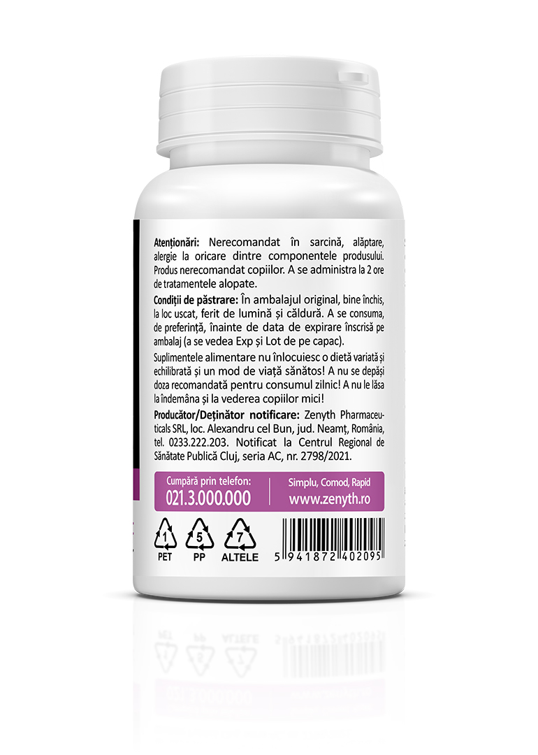 Producător/Deținător notificare: Zenyth Pharmaceuticals SRL, loc. Alexandru cel Bun, jud. Neamț, România, tel. 0233.222.203. Produs înregistrat și notificat la Centrul Regional de Sănătate Publică Cluj, seria AC, nr. 2798/2021.