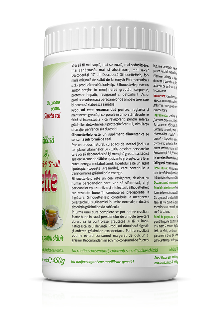 SilhouetteHelp este un supliment alimentar sub formă de ceai din plante medicinale, cu adaos de inozitol (inclus în complexul vitaminelor B). Ceaiul este un adjuvant prețios în curele de slăbire, protector hepatic, revigorant și detoxifiant.