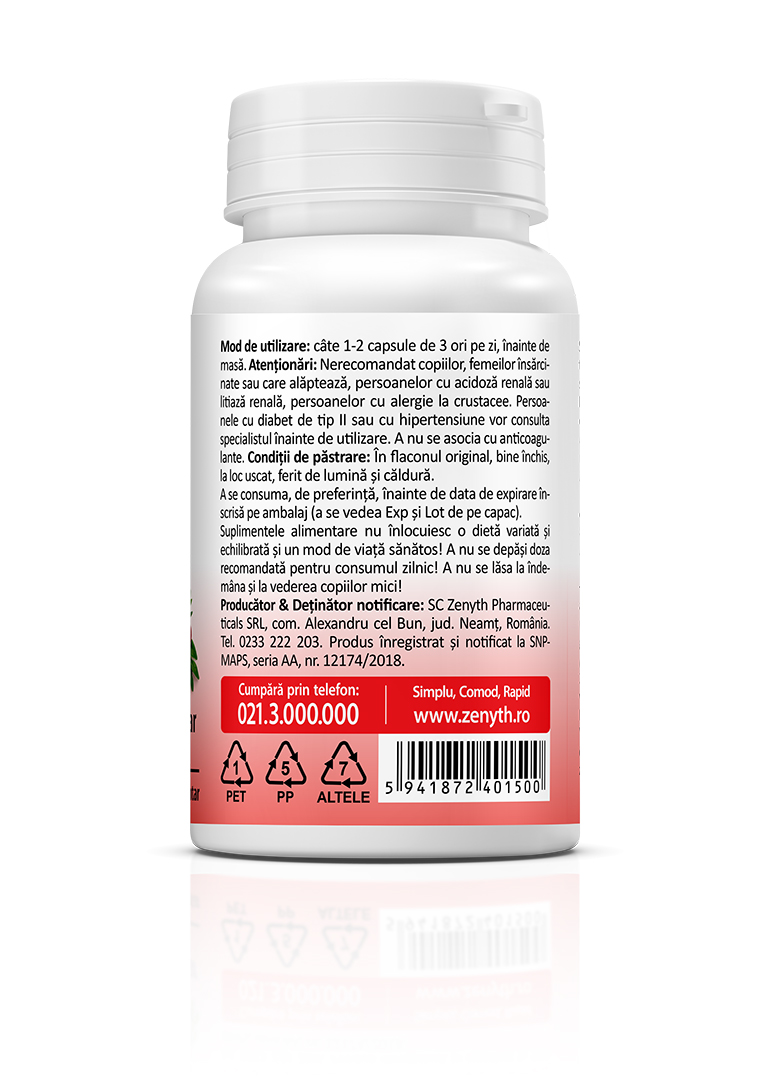 Producător/ Deținător notificare: Zenyth Pharmaceuticals SRL, loc. Alexandru cel Bun, str. Petru Rareș nr. 50A, jud. Neamț, România, tel. 0233.222.203. Produs înregistrat și notificat la SNPMAPS, seria AA, nr. 12176/2018.