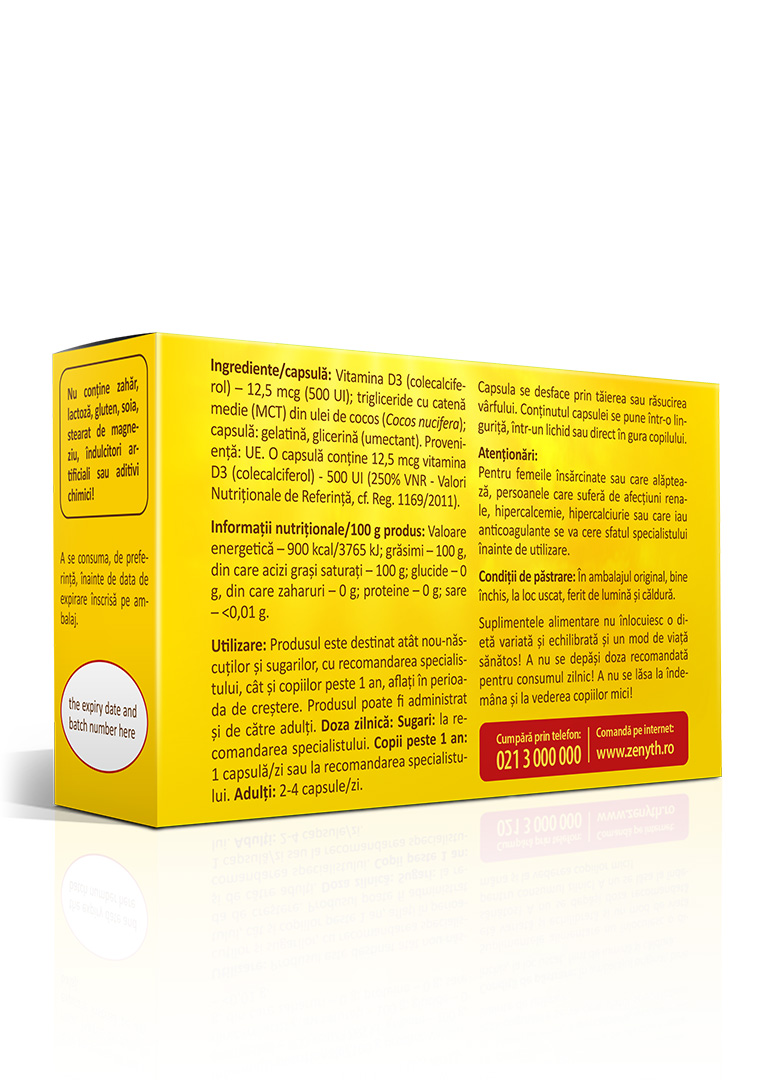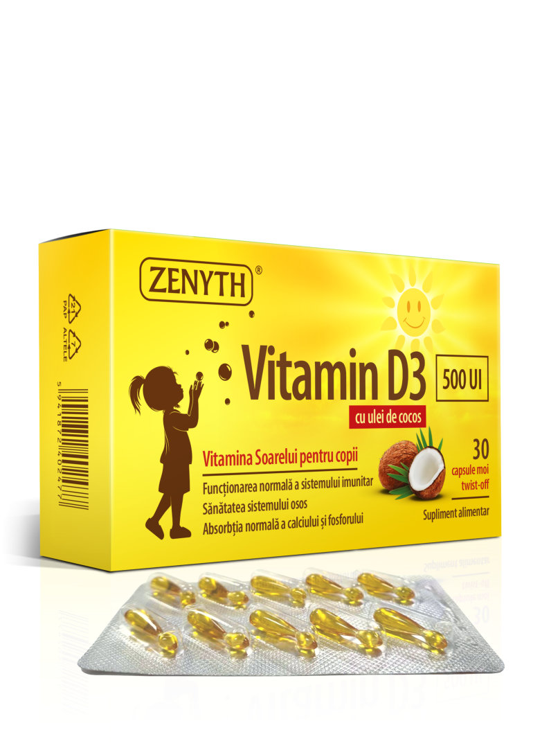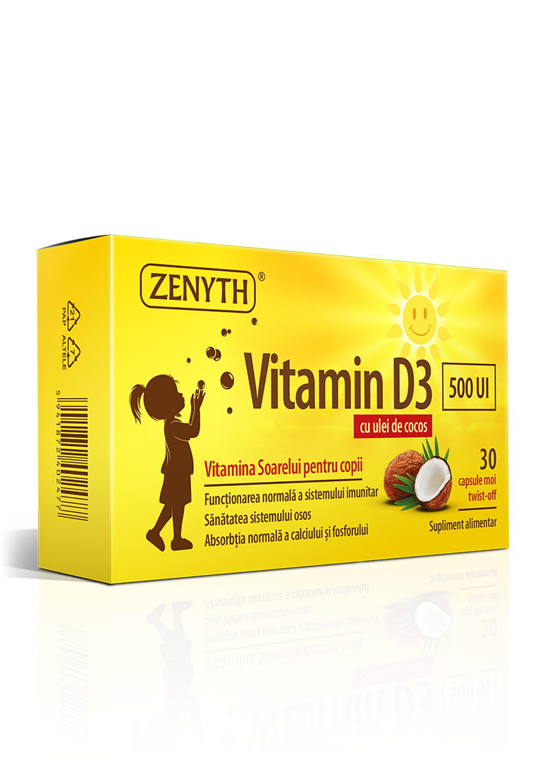 Vitamin D3 500 UI de la Zenyth este un produs destinat atât copiilor, cât și adulților. O capsulă conține 500 UI vitamina D3. În acest produs, vitamina D3 are un suport de MCT (trigliceride cu catenă medie) din ulei de cocos. Suportul uleios asigură buna asimilare a vitaminei D.  Capsulele de Vitamin D3 500 UI sunt capsule cu sistemul twist-off, ceea ce permite administrarea produsului în rândul copiilor care nu pot înghiți capsule.