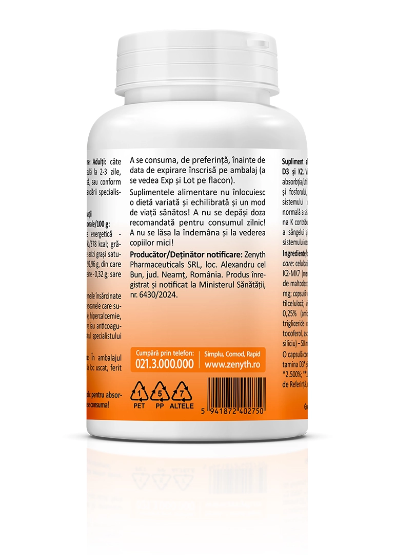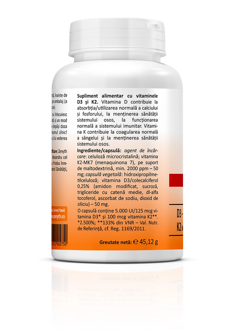 - Contine 5000 UI vitamina D3 si 100 mcg vitamina K2-MK7 pe capsula.