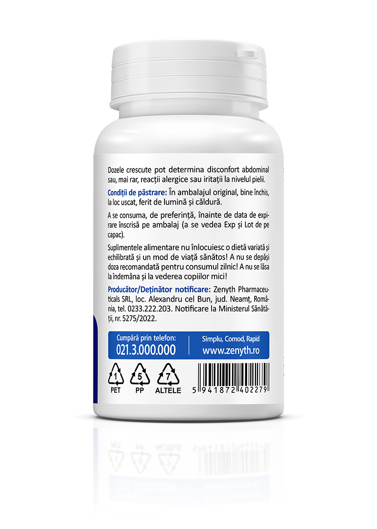 Producător/Deținător notificare: Zenyth Pharmaceuticals SRL, loc. Alexandru cel Bun, jud. Neamț, România, tel. 0233.222.203. Produs înregistrat și notificat la Ministerul Sănătății, nr. 5275/2022.