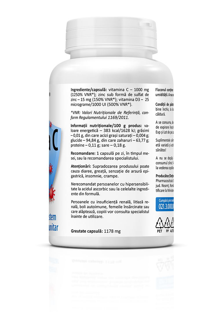 1000 mg vitamina C + 15 mg zinc + 1000 UI vitamina D3. Acestea sunt dozele per capsulă din cei trei nutrienți esențiali pentru imunitate.