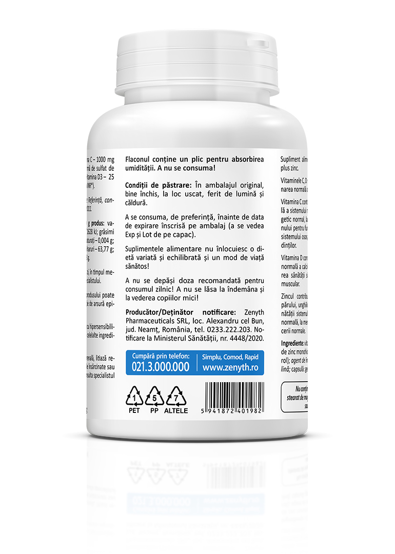 Producător/ Deținător notificare: Zenyth Pharmaceuticals SRL, loc. Alexandru cel Bun, jud. Neamț, România, tel.: 0233.222.203. Produs înregistrat și notificat la Ministerul Sănătății, nr. 4448/2020.