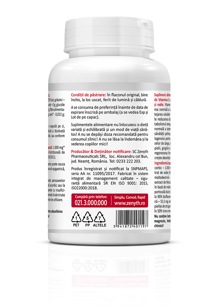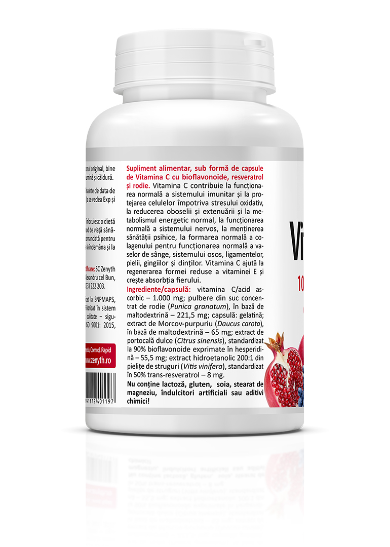 Conținut de vitamina C / capsulă: 1000 mg*. (*1250% din VNR – Valoarea Nutrițională de Referință conform Regulament 1169/2011).