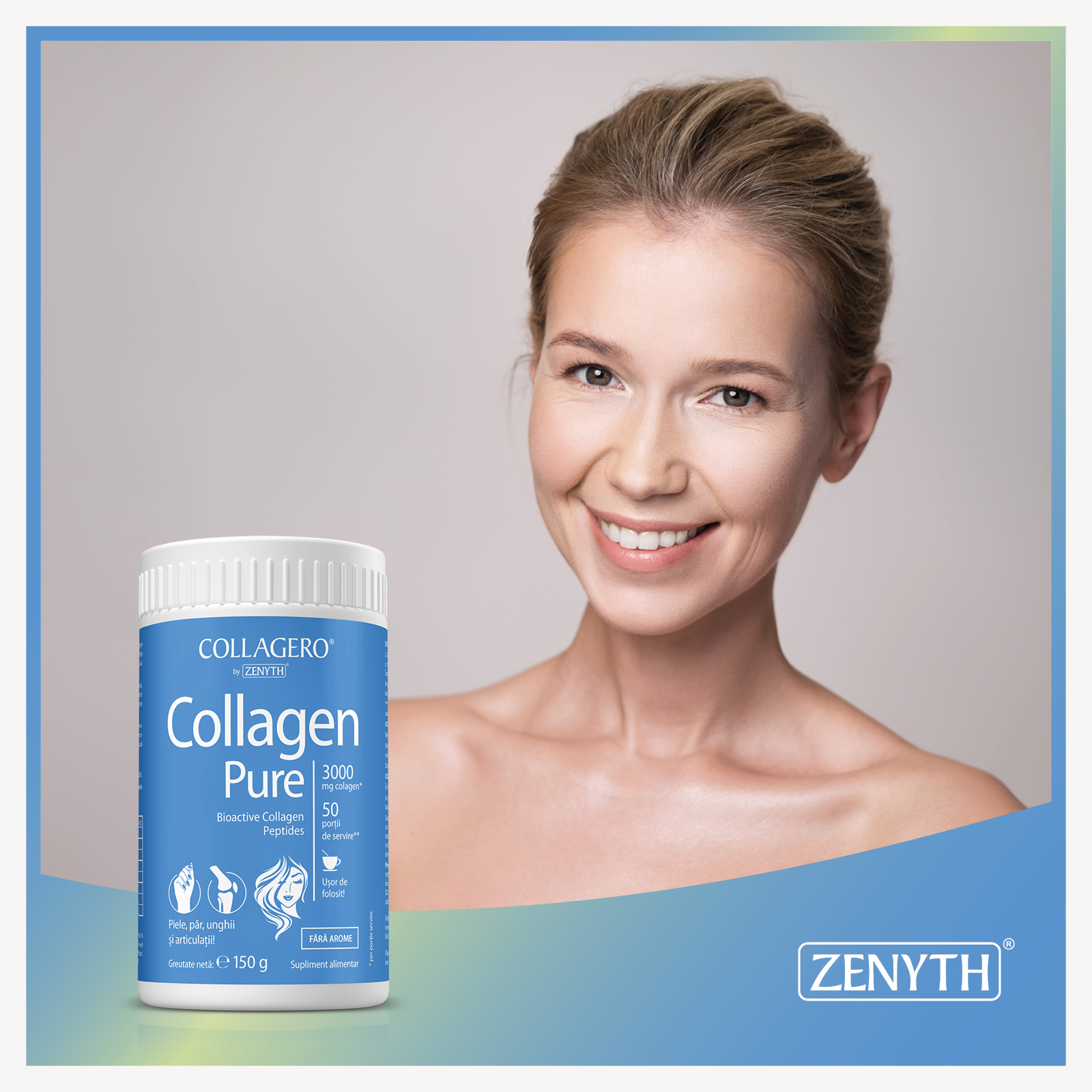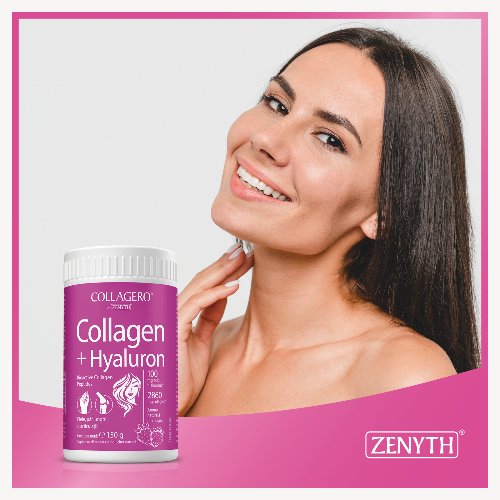 Așadar, administrarea de suplimente alimentare cu colagen ajută la creșterea producției de colagen din organism, cu efect benefic pentru piele și articulații, însă și la producția de alte proteine utile, precum elastina și fibrina. Ai mai folosit, până acum, produse cu colagen? Dacă vrei să introduci în rutina ta un smoothie delicios, poți apela cu încredere la suplimentele cu colagen sub formă de pulbere de la Zenyth, care nu conțin gluten, îndulcitori artificiali sau aditivi chimici. De ce să alegi suplimentele cu colagen de la Zenyth? Produsele cu colagen din gama Collagero de la Zenyth conțin un amestec de peptide bioactive de colagen Verisol®, de tip I și III, sub formă de pulbere. În cazul acestor produse, molecula de colagen, printr-un proces patentat de hidroliză, a fost „spartă” în microparticule pentru a i se facilita metabolizarea și asimilarea. Verisol® este unul dintre cele mai testate și apreciate branduri producătoare de colagen hidrolizat, fiind cea mai utilizată marcă de colagen în produsele de frumusețe, la nivel mondial. Studiile au demonstrat că Verisol® are capacitatea de a stimula metabolismul colagenului din piele, prin urmare îmbunătățește structura și aspectul pielii, grăbește regenerarea, mărește gradul de hidratare și întârzie formarea ridurilor. Pentru a înțelege mai bine cum funcționează peptidele de colagen hidrolizat, trebuie spus că în procesul de digestie, o parte dintre acestea sunt descompuse în aminoacizi, care sunt absorbiți apoi de fluxul sangvin și utilizați pentru sinteza de colagen în organism. Celelalte peptide sunt transportate intacte prin mucoasa intestinală și sunt depozitate inclusiv la nivelul pielii. Din gama Collagero fac parte 3 produse pe bază de colagen hidrolizat Verisol®, de origine animală: Collagen Pure, Collagen Strawberry și Collagen+Hyaluron, fiecare conținând 50 de porții de servire. Sub formă de pulbere, sunt foarte ușor de utilizat, în funcție de preferințele fiecăruia, putând fi adăugat în apă, ceai, fresh-uri, smoothie-uri sau chiar cafea, în cazul variantei Pure, fără aromă. Se pretează a fi adăugate chiar și în rețete de antreuri sau deserturi. Niciunul dintre produse nu conține lactoză, gluten, soia, îndulcitori artificiali sau aditivi chimici. Collagen Pure furnizează 3.000 mg de colagen pur de tip I și III per porția de servire de 3 grame, Collagen Strawberry – 2.960 miligrame și Collagen+Hyaluron – 2.860 miligrame de colagen și 100 mg de acid hialuronic. Varianta de colagen îmbogățit cu 100 de miligrame de acid hialuronic maximizează efectele benefice în ceea ce privește sănătatea pielii, părului, unghiilor și articulațiilor. Acidul hialuronic acționează atât asupra pielii și părului, sporind hidratarea internă și elasticitatea, cât și asupra articulațiilor.